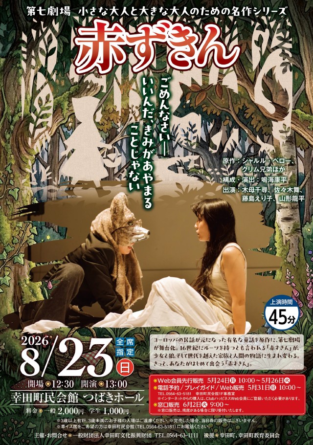 ヨーロッパの民話が元になった有名な童話を原作に、第七劇場が舞台化。16世紀にルーツを持つとも言われる「赤ずきん」が、少女と狼、そして世代を越えた家族と人間の物語に生まれ変わる。きっと、あなたがはじめて出会う「赤ずきん」。