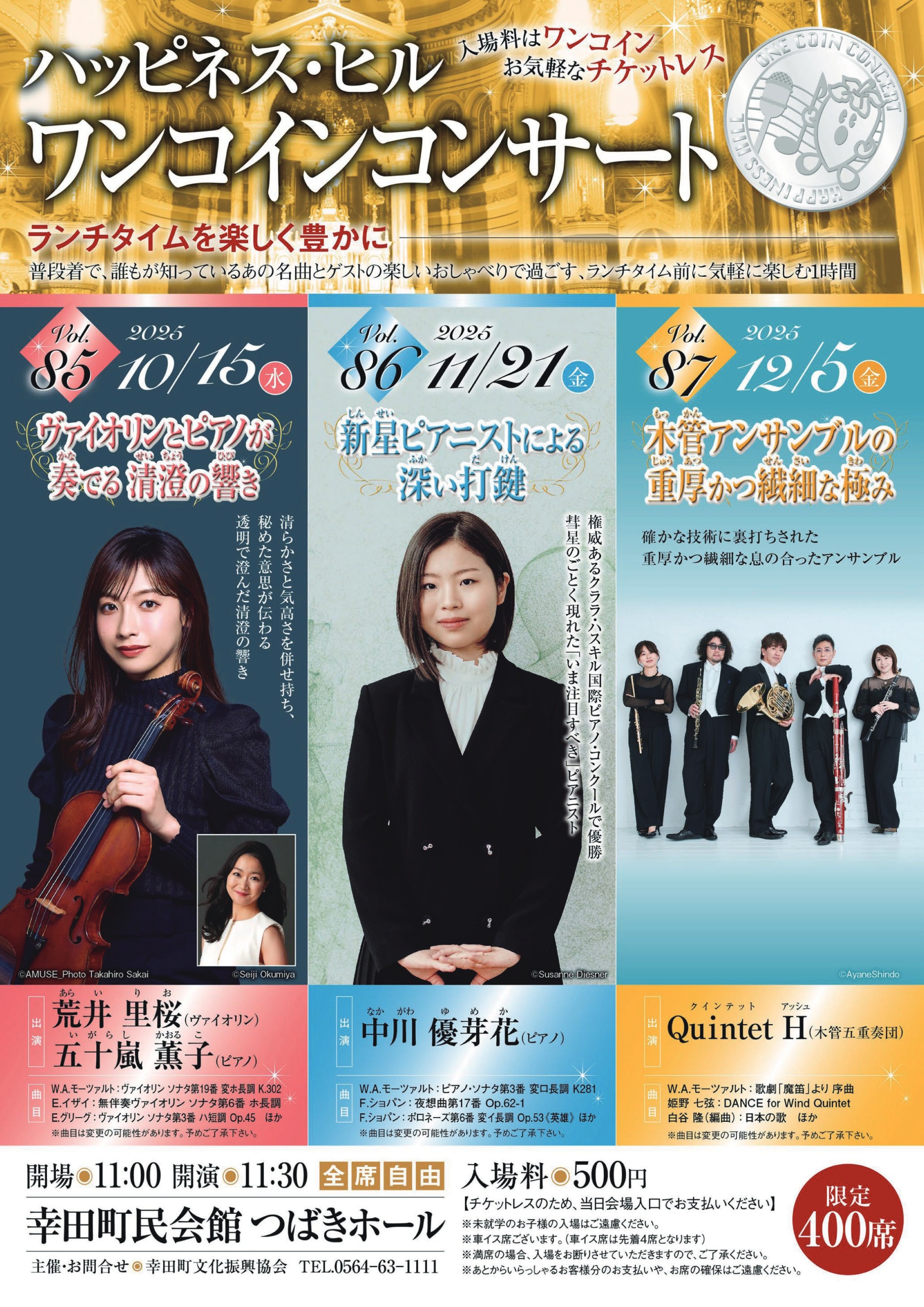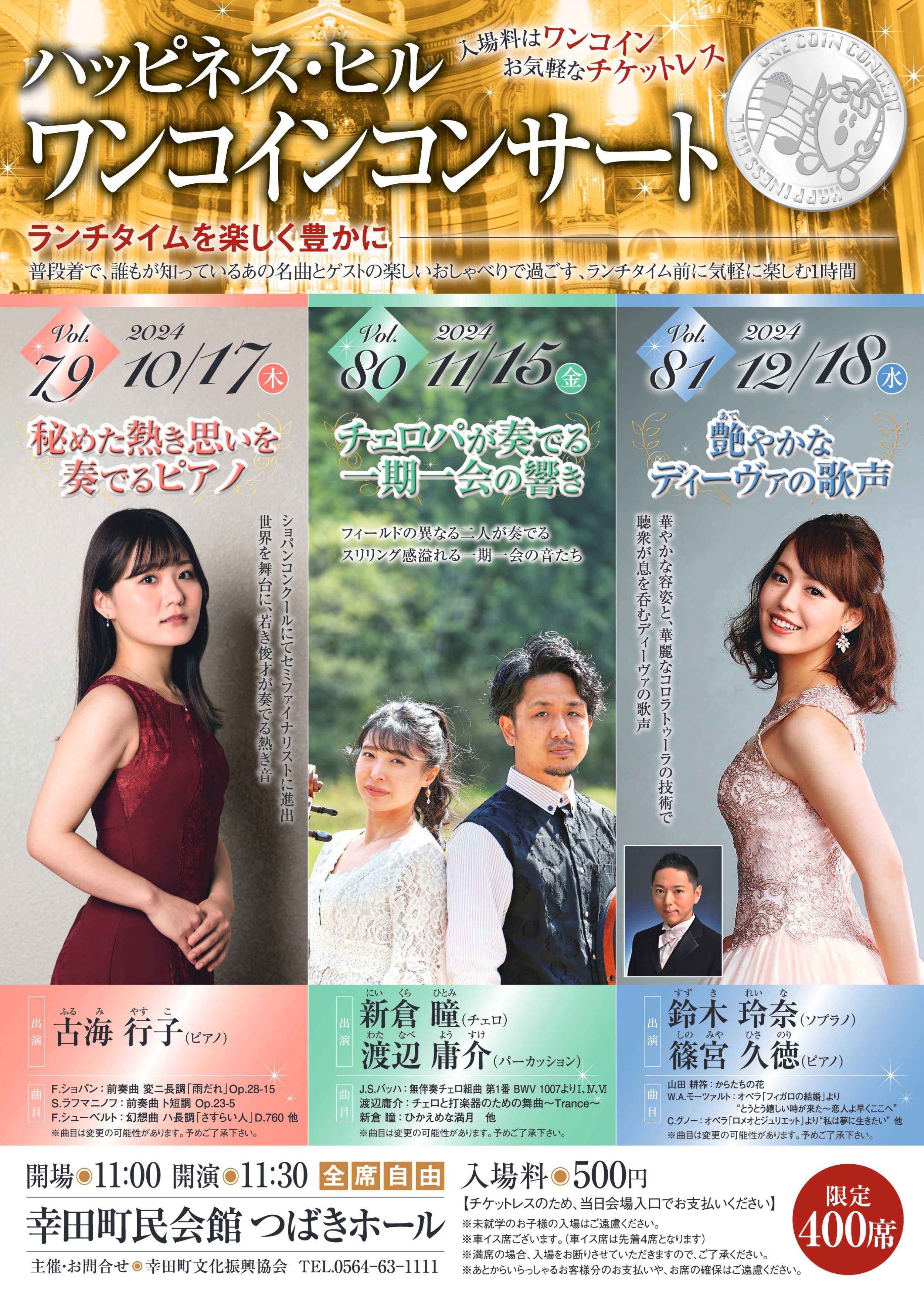 ワンコインコンサート 入場料はワンコイン お気軽なチケットレス 【アーカイブ】ハッピネス・ヒル ワンコインコンサート ランチタイムを楽しく豊かに 普段着で、誰もが知っているあの名曲とゲストの楽しいおしゃべりで過ごす、ランチタイム前に気軽に楽しむ1時間 日時 4~6月と10~12月に開催しています。 開場:11:00 開演:11:30 会場 幸田町民会館つばきホール 料金 500円〈全席自由〉 ※チケットレスのため、お釣りのないよう当日会場入口にてお支払いください。 ※マスクの着用は個人の判断となりますので、ご理解ご協力をお願いいたします。 主催 幸田町文化振興協会 終演したワンコインコンサート