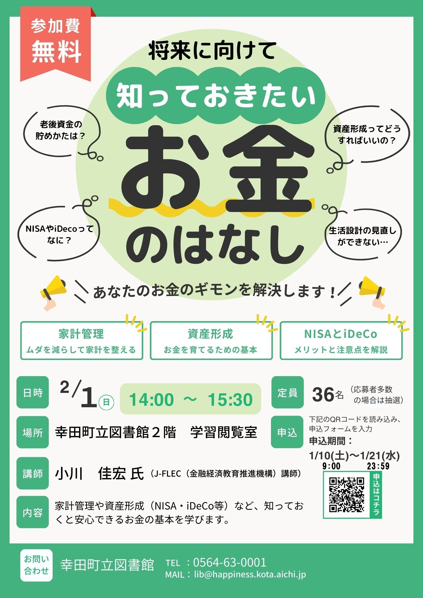 - 2026年2月7日(土)9:00から、電話(0564-63-0001)または図書館1階カウンターにて受付します。