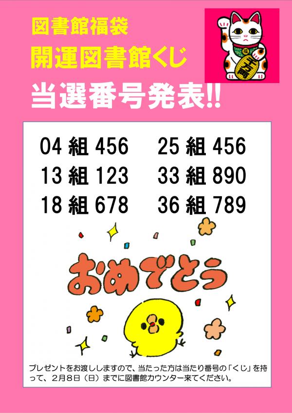 2026年01月10日(土)NEW イベント 2026図書館福袋 開運図書館くじ 当選番号発表! 図書館福袋の当選番号発表! 当選した方はプレゼントを差し上げます。当たり番号のくじを持って、2月8日(日)までに図書館カウンターに来てください。