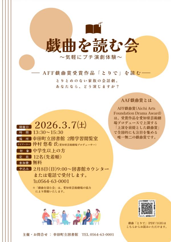 2026年01月21日(水) イベント 気軽にプチ演劇体験 戯曲を読む会 戯曲をみんなで読み合わせて、魅力を味わってみませんか? 開催日時 3月 7日(土)13:30~15:30 対象 中学生以上の方 演目 『とりで』(AAF戯曲賞受賞作品) ナビゲーター 仲村 悠希氏(愛知県芸術劇場プロデューサー) 場所 幸田町立図書館 2階 学習閲覧室 定員 12名(先着順) 参加費 無料 申込み 2月8日(日) 9:00〜図書館カウンターまたは電話で受付します。TEL 0564-63-0001