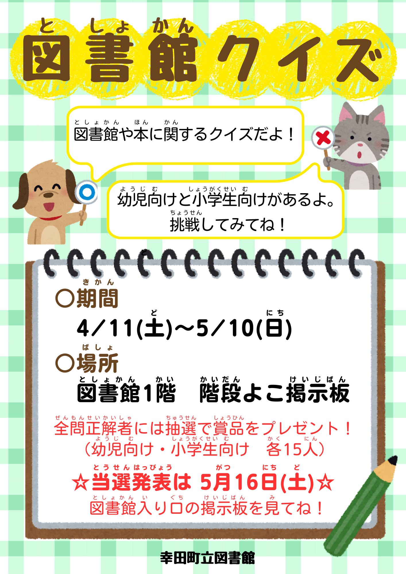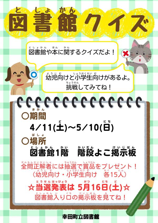 2026年04月04日(土)NEW イベント 図書館クイズに挑戦しよう! クイズを全問正解するとプレゼントがもらえるかも!? 期間 4月11日(土)~ 5月10日(日) 場所 幸田町立図書館 1階 階段横掲示板 対象 小学生以下 内容 図書館に関するクイズを解いて全問正解すると、抽選で30名に賞品が当たります。 その他 当選発表は5月16日(土)から図書館入口に掲示します。