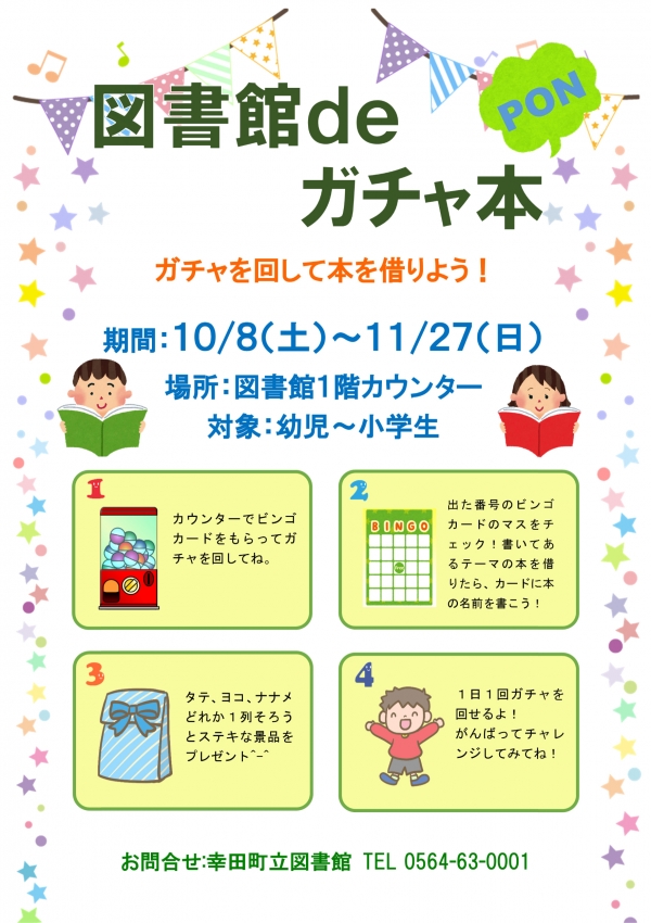 2022年10月05日(水) イベント 終了図書館deガチャ本 ~ガチャをまわして本を借りよう!~ ガチャをまわして本を借りよう! 開催期間 2022年10月8日(土)~11月27日(日) 対象 幼児〜小学生 内容 ビンゴカードに番号に書いてあるテーマの本を借りて、1列そろうとプレゼントがもらえます。 その他 ・カウンターでビンゴカードをもらってください。・ガチャは1日1回までです。