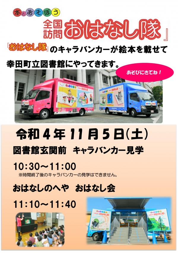 2022年10月05日(水) イベント 終了本と遊ぼう「全国訪問おはなし隊」がやってくる! おはなし隊のキャラバンカーが絵本を載せて図書館にやってきます! 開催日時 2022年11月5日(土) ・キャラバンカー見学 10:30~11:00※時間終了後のキャラバンカーの見学はできません・おはなしのへや おはなし会 11:10~11:40 対象 どなたでも 申込み お申込みは不要です。当日直接図書館にご来館ください。