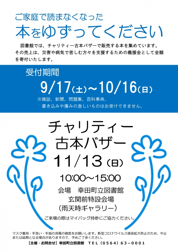 2022年10月05日(水) イベント 終了チャリティー古本バザーを開催します 皆様にご寄贈いただいた本を販売し、被災地の復興を支援します。 売上は全て日本赤十字社を通して被災地に寄付いたします。 日時 2022年11月13日(日) 10:00~15:00 場所 図書館玄関前特設会場(雨天時はギャラリー) 内容 中古本の販売(単行本1冊100円、文庫本1冊50円) 本の寄贈をお願いします 受入期間 9月17日(土)~10月16日(日) ・資料の状態によってはお受けできない場合もあります。・雑誌、新聞、問題集、百科事典、その他傷みヤケの激しいものはお受けできません。