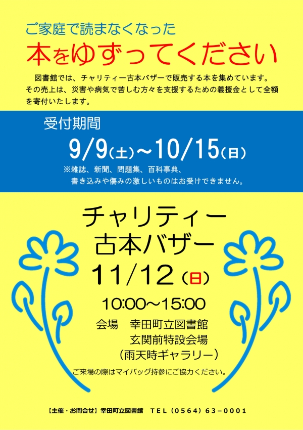 2023年08月29日(火) イベント チャリティー古本バザーを開催します 皆様にご寄贈いただいた本を販売し、被災地の復興を支援します。 売上は全て被災地に寄付いたします。 日時 2023年11月12日(日) 10:00~15:00 場所 図書館玄関前特設会場(雨天時はギャラリー) 内容 中古本の販売(単行本1冊100円、文庫本1冊50円) 本の寄贈をお願いします 受入期間 9月9日(土)~10月15日(日) ・資料の状態によってはお受けできない場合もあります。・雑誌、新聞、問題集、百科事典、その他傷みヤケの激しいものはお受けできません。