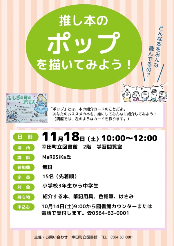 2023年10月04日(水) イベント 終了推し本のポップを描いてみよう! 「ポップ」とは、本の紹介カードのことだよ。あなたのおススメの本を、絵にしてみんなに紹介してみよう! 日時 2023年11月18日(土) 10:00~12:00 場所 幸田町立図書館 2階 学習閲覧室 講師 MaRüSiKa 氏 対象 小学3年生から中学生 定員 15名(先着順) 参加費 無料 申込み 10月14日(土)9:00から図書館1階カウンターまたは電話(℡ 0564-63-0001)にて受付します。