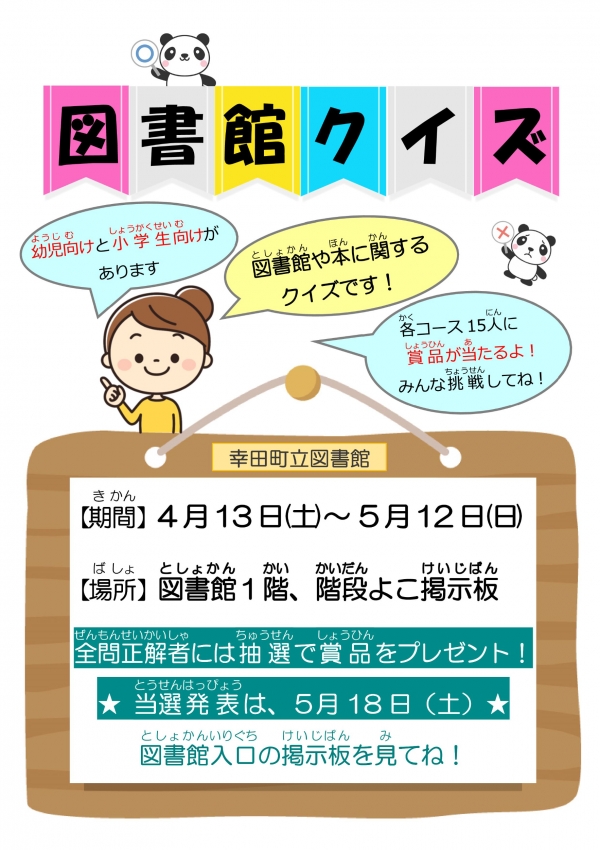 2024年04月02日(火) イベント 終了図書館クイズに挑戦しよう! クイズを全問正解するとプレゼントがもらえるかも!? 期間 4月13日(土)~ 5月12日(日) 場所 幸田町立図書館 1階 階段横掲示板 対象 小学生以下 内容 図書館に関するクイズを解いて全問正解すると、抽選で30名に賞品が当たります。 その他 当選発表は5月18日(土)から図書館入口に掲示します。