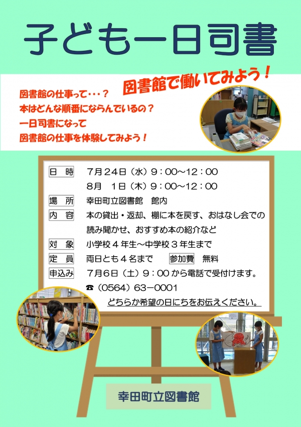 2024年06月11日(火) イベント 終了子ども一日司書 一日司書になって図書館の仕事を体験してみよう! 日時 2024年7月24日(水) 9:00~12:00 2024年8月 1日(木) 9:00~12:00 場所 幸田町立図書館 館内 内容 本の貸出・返却、本を棚に戻す、おはなし会での読み聞かせ、おすすめ本の紹介など。 定員 両日とも4名まで(先着順) 対象 小学4年生~中学3年生まで 参加費 無料 申込み 7月6日(土)9:00から、電話(0564-63-0001)で受付。 ※どちらか希望の日にちをお伝えください。