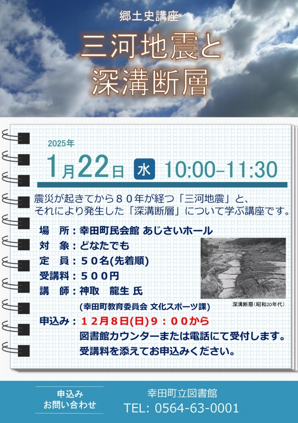 2024年12月24日(火) イベント 終了郷土史講座「三河地震と深溝断層」受講生募集中 震災が起きてから80年が経つ「三河地震」と、それにより発生した「深溝断層」について学ぶ講座です。 日時 2025年1月22日(水) 10:00~11:30 「三河地震と深溝断層」講師:神取 龍生 氏(幸田町教育委員会 文化スポーツ課) 場所 幸田町民会館 あじさいホール 定員 50名(先着順) 対象 どなたでも 受講料 500円 申込方法 2024年12月 8日(日)9:00から、電話(0564-63-0001)または図書館1階カウンターにて受付。