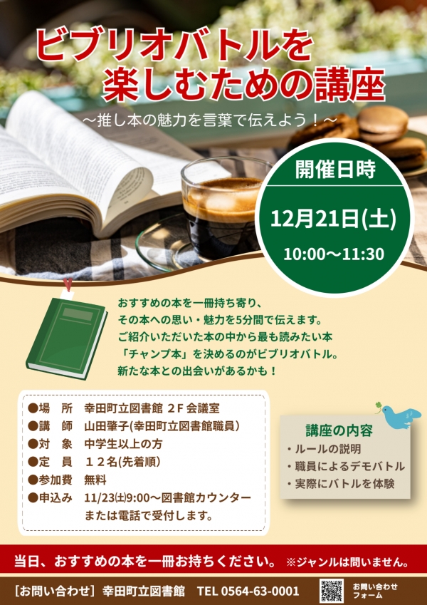 - 11月23日(土)9:00~電話(0564-63-0001)または図書館1階カウンターにて受付。
