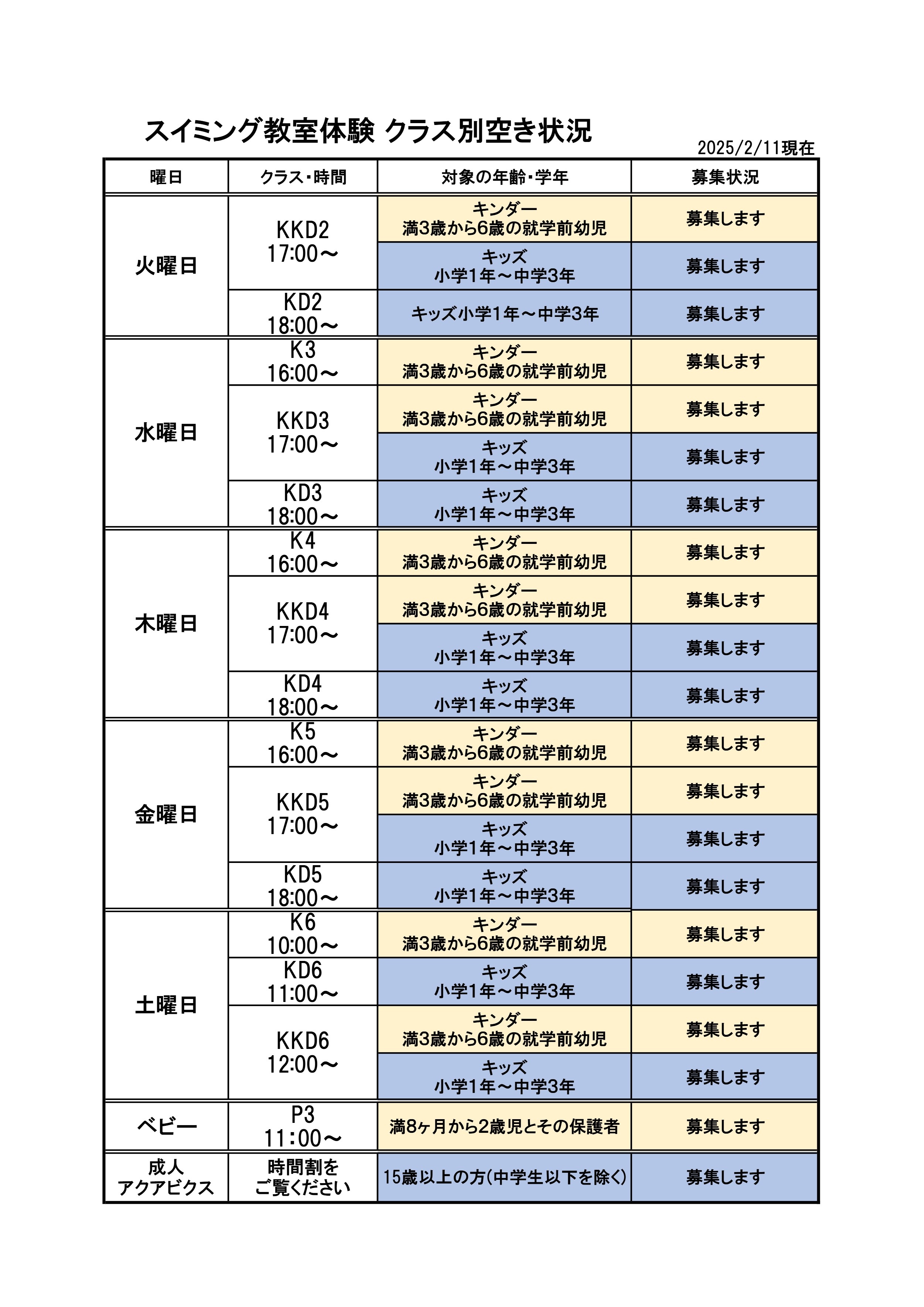 - スイミング教室時間割内で、ご都合の良い教室を1回体験できます。