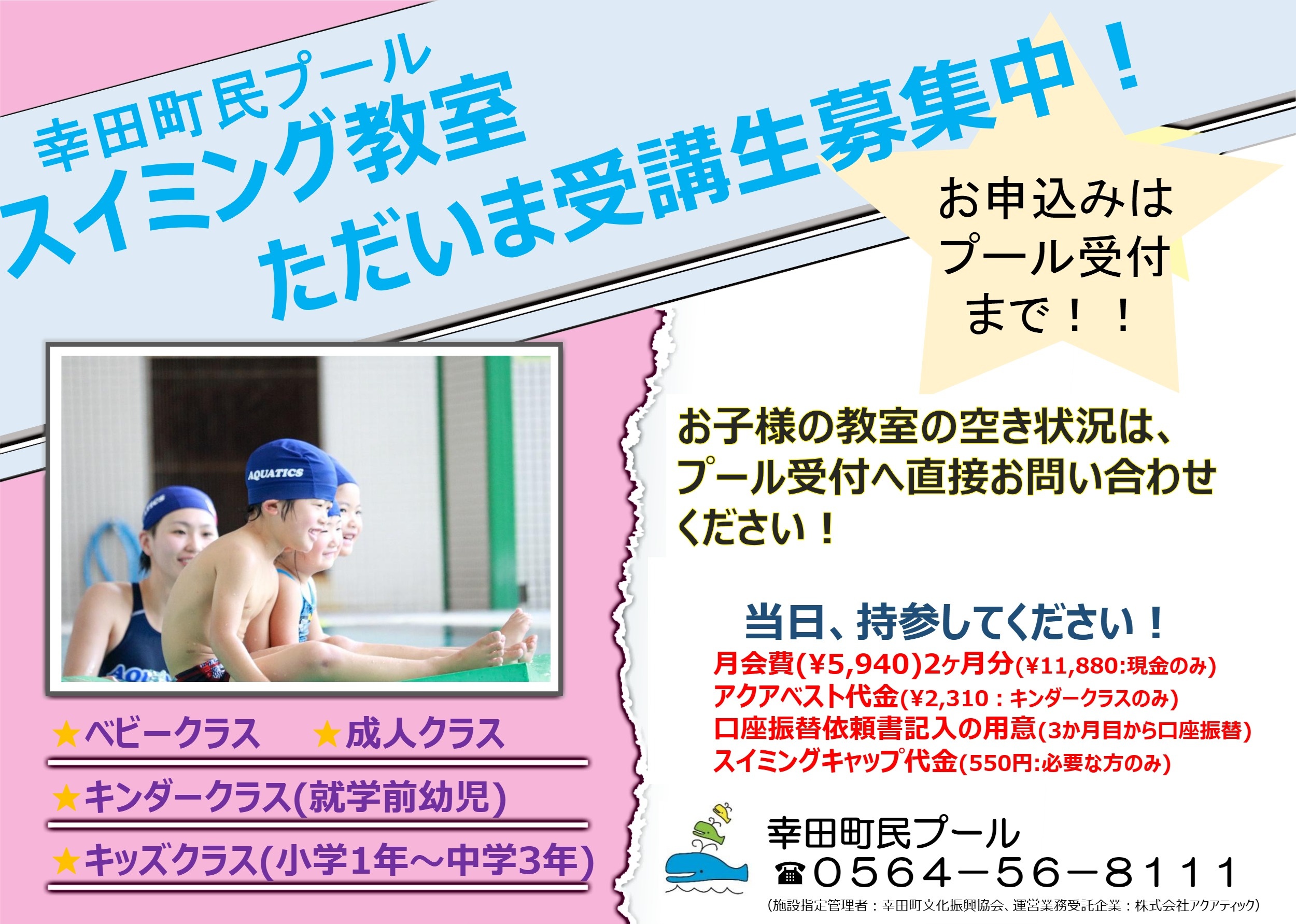 ※現在の募集クラスについては、プール受付へ直接、お問い合わせください。